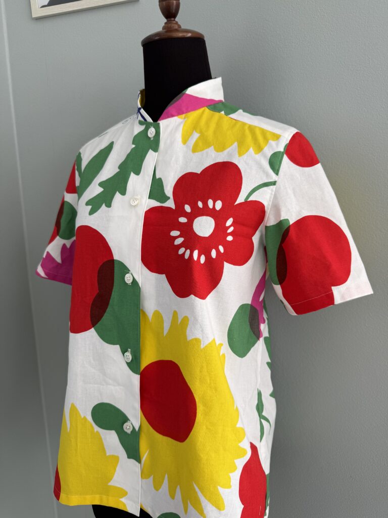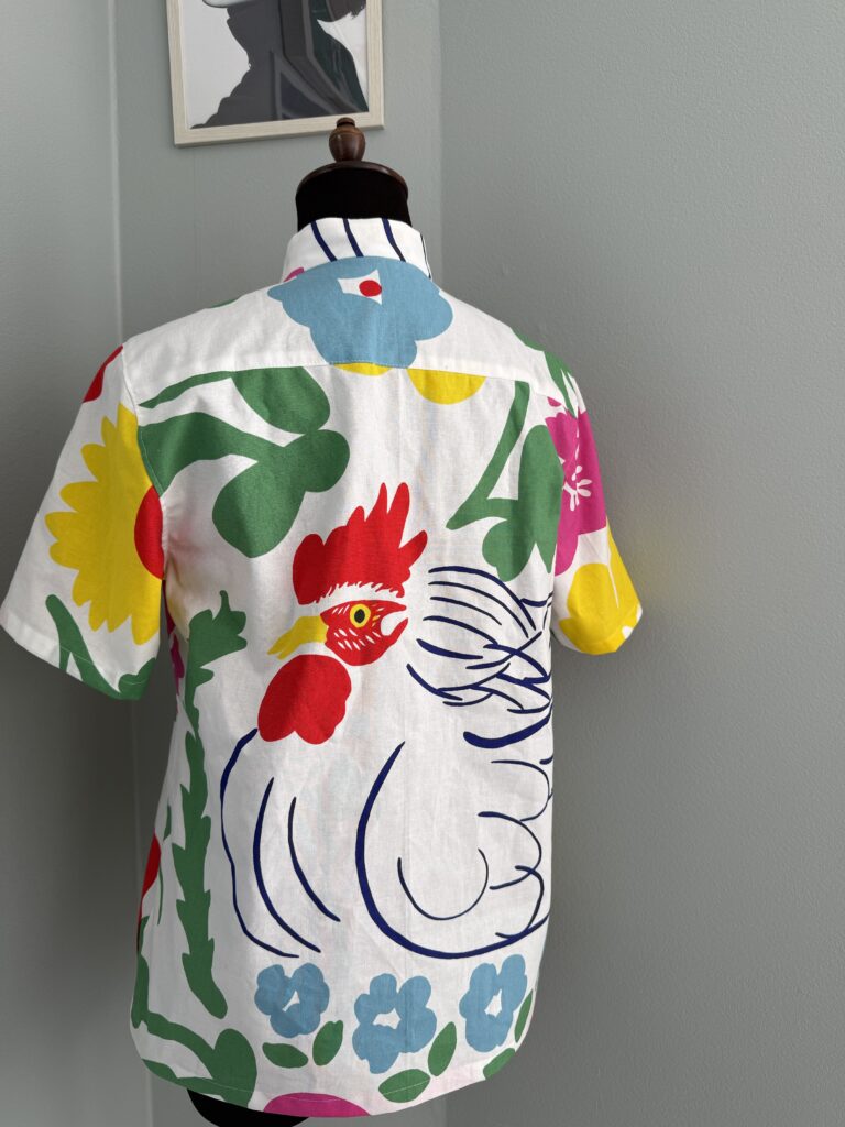 ニワトリシャツ 2025-10-23 post お客様お持込の布でシャツを製作 リクエストは 背中の真ん中にドンとニワトリを 残布が殆ど出ないほど きっちり使い切りました とってもカラフルで 見ているだけで元気が出る一枚になりました